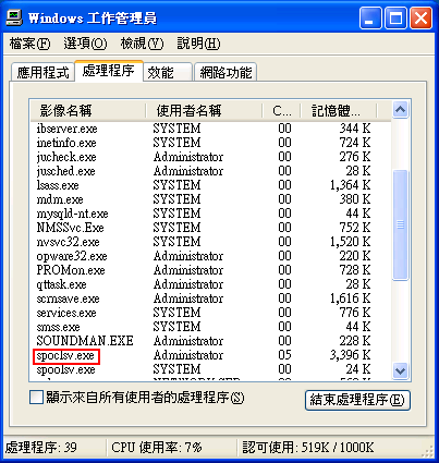 | 2. | 選取 spoclsv.exe(注意不是spoolsv.exe),用滑鼠按 結束處理程序 按鈕。 |