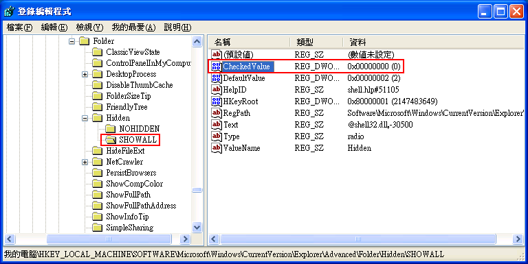 | HKEY_LOCAL_MACHINE\SOFTWARE\Microsoft\Windows\CurrentVersion\Explorer\Advanced\Folder\Hidden\SHOWALL CheckedValue---> 0x00000001 |
