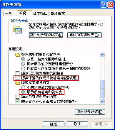| 6. | 開啟我的電腦 / 工具 / 資料夾選項 / 檢視,做如下紅色框線內的設定 |