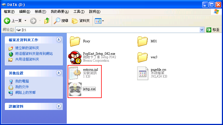 按確定後,可以在每一個磁碟機的根目錄下找到二個隱藏檔autorun.inf 和 setup.exe(如下圖),這就是病毒程式,將其刪除。 |